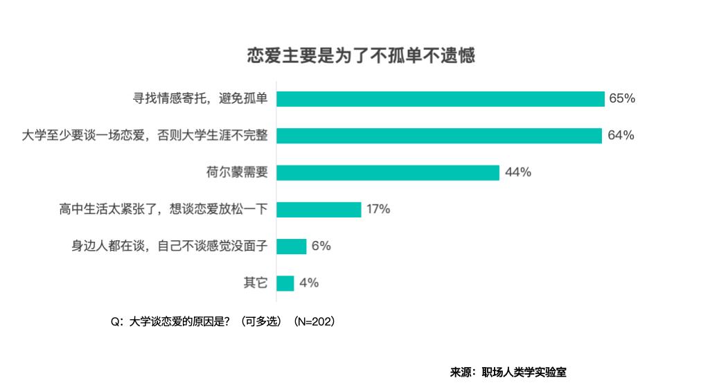 面临爱情,虽然佛系随缘是大都,谈爱情图啥?陪同才是最长情的广告。65% 受访者为了 “寻找感情依靠,避免孤独”,65% 感觉 “大学至多要谈一场爱情”,不想留可惜;44%%坦言荷尔蒙需求是爱情的缘由。只要 5。9% 是因 “身边人影响” 跟风,不是大都人的选择。