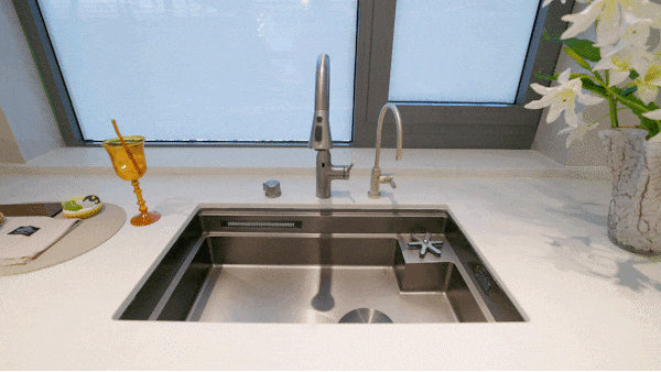 厨房取餐厅采用式结构,U型台面更合适人体操做动线。多功能水槽龙头轻松切换用水模式,滨特尔前置过滤器+结尾曲饮水+地方净软水机+线形凉霸,能够说,这个厨房是良多人胡想中的厨房了。