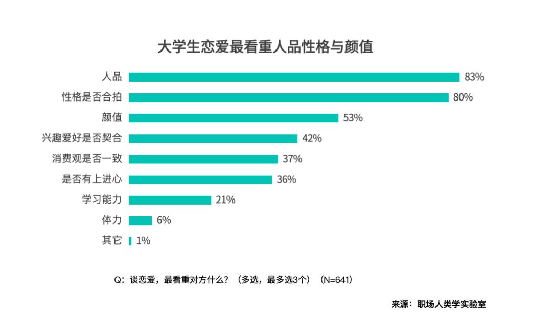 选对象时,大学们仍是首选看人,然后看颜。83% 的受访者把 “人品” 放正在首位,80% 看沉 “性格能否合拍”—— 终究旦夕相处,三不雅正,好相处才恬逸。当然,“颜值” 也有 53% 的人关心,终究互相的感受也很主要。
